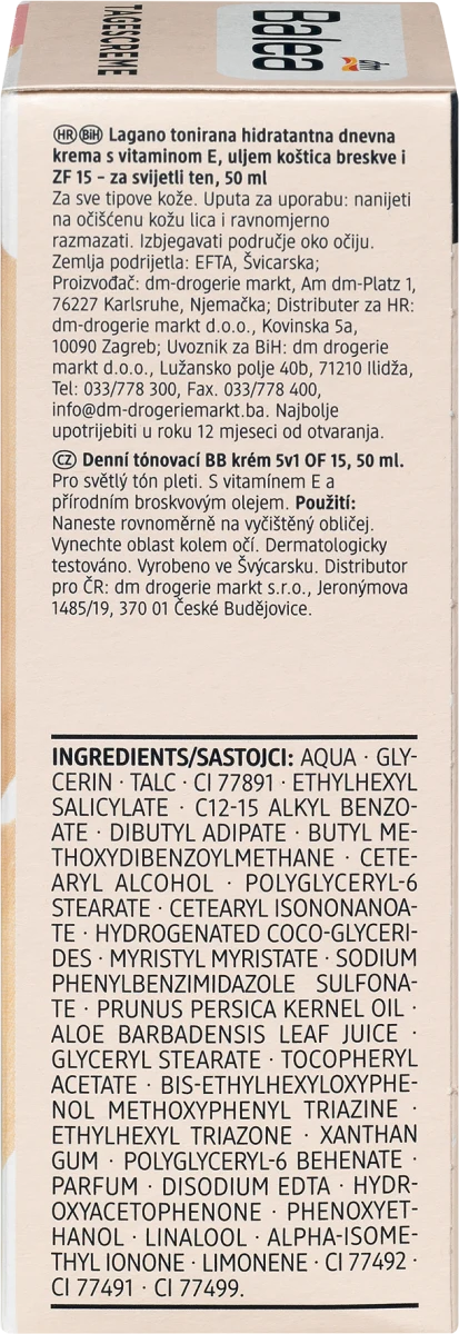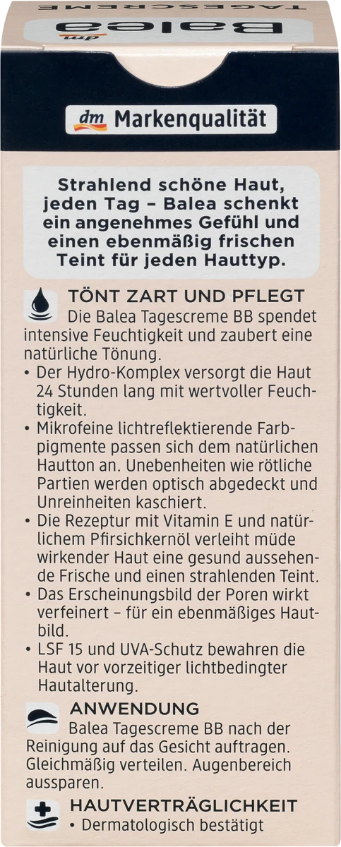 The Balea Day Cream BB light skin tone SPF 15 provides intensive moisture and conjures up a natural tint.