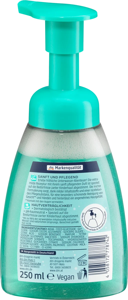 Moisten your hands and apply the Balea washing foam Underwater Friends. Soap hands and face. Avoid contact with the eyes. Then rinse your face and hands thoroughly with water and dry well.
