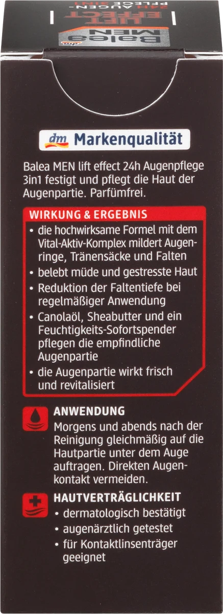 Balea MEN lift effect anti-wrinkle day cream with special active complex ensures firm and firm men’s skin – every day.