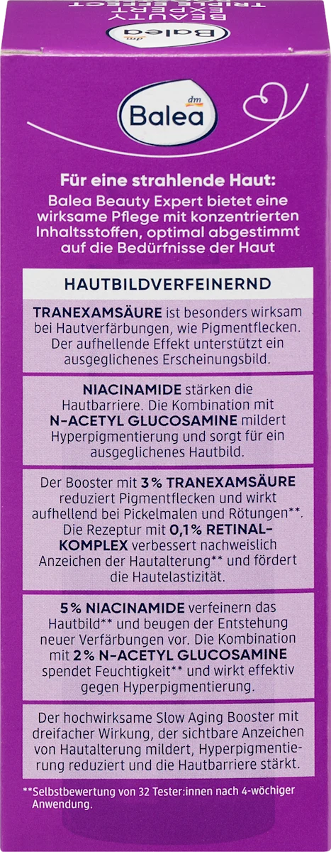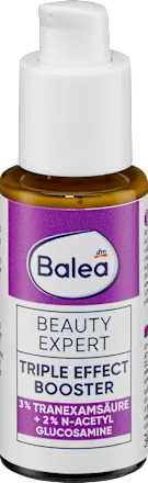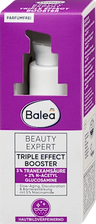 The Triple Effect Booster from Balea is a highly effective facial fluid specially developed to meet the diverse needs of the skin. With its concentrated ingredients, it offers targeted care that can help reduce visible signs of aging and improve skin texture*. At the same time, it can reduce hyperpigmentation and strengthens the skin barrier*, so that the skin appears more resilient and radiant.
