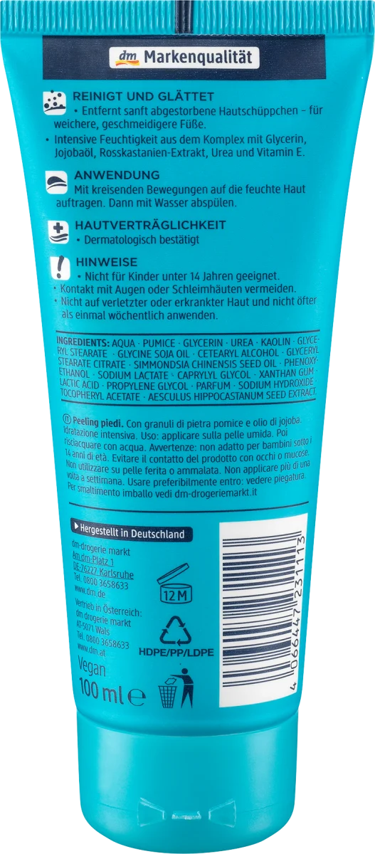 The intense moisture from the complex with glycerin, jojoba oil, horse chestnut extract, urea and vitamin E ensures softer, smoother feet.