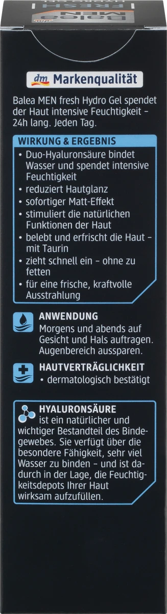 Balea MEN fresh hydrogel provides your skin with intensive moisture thanks to double hyaluronic acid.