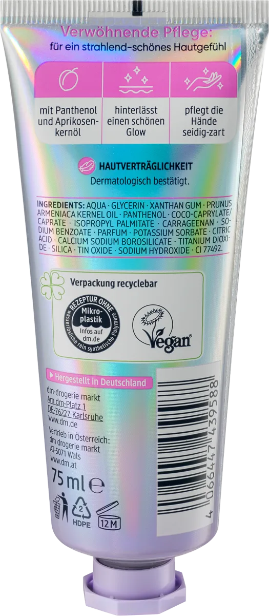 The Balea Handfluid Glow with panthenol and apricot kernel oil nourishes the hands silky and delicate.