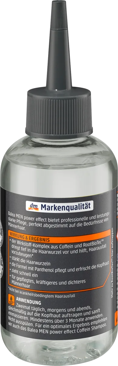 The Power Effect Caffeine Boost Tonic from Balea MEN can help reduce hair loss. The unique active ingredient complex of caffeine and Rootbio Tec penetrates deep into the hair root and strengthens the roots in order to prevent hair loss.