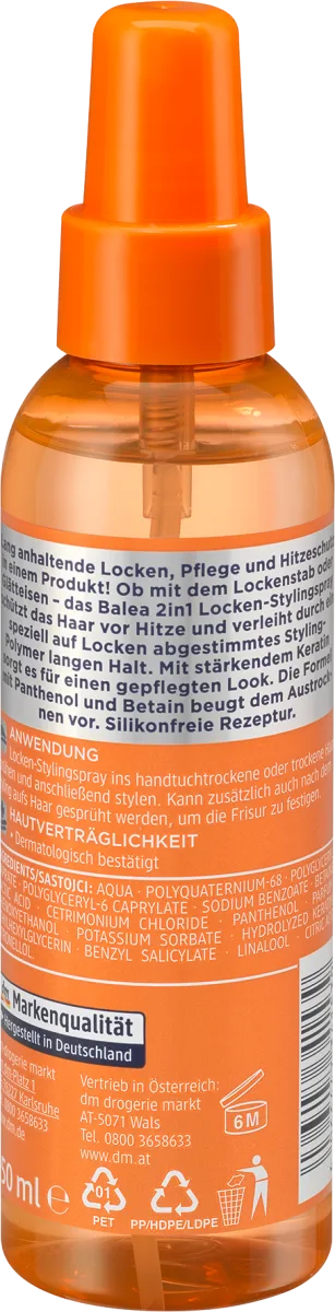 – the Balea 2in1 curl styling spray protects the hair from heat and gives long hold thanks to a styling polymer specially adapted to curls.