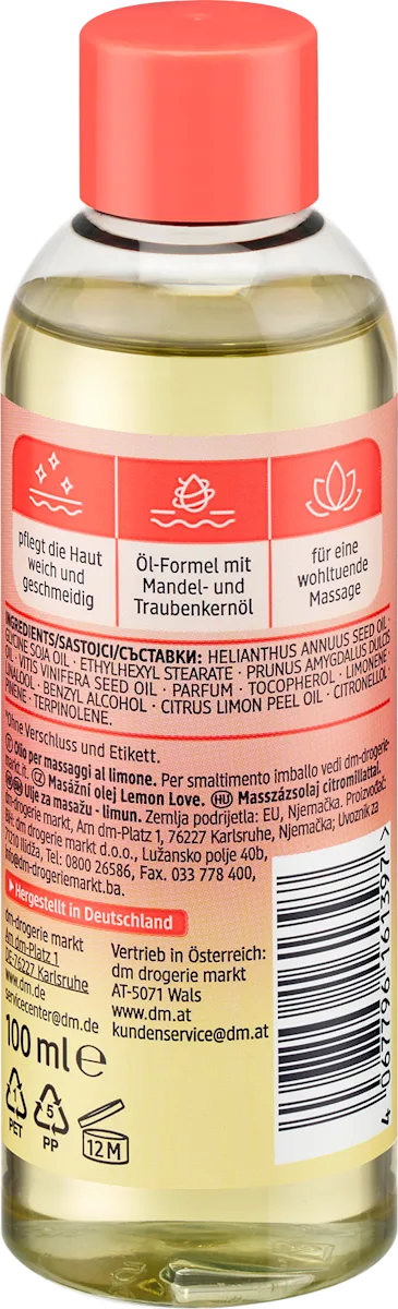 Balea’s Lemon Love massage oil pampers the skin with its sweet, citrusy scent and leaves it feeling velvety soft.