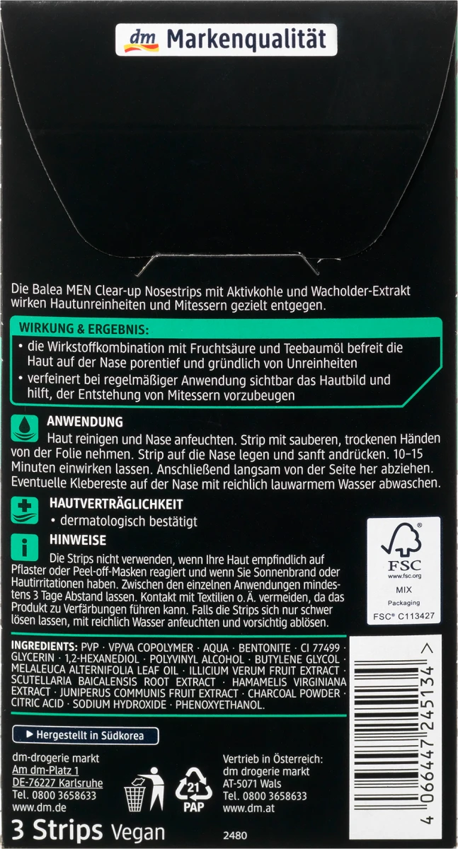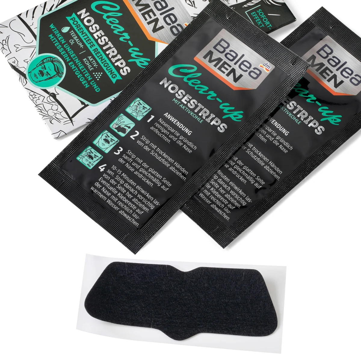 Balea MEN Clear-Up Nose Strips with activated carbon and juniper extract specifically counteract skin impurities and blackheads.