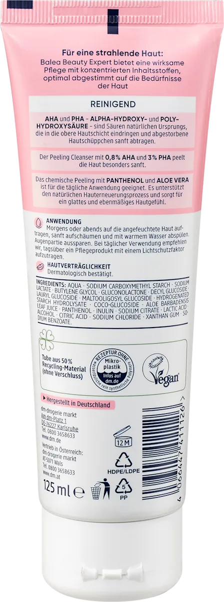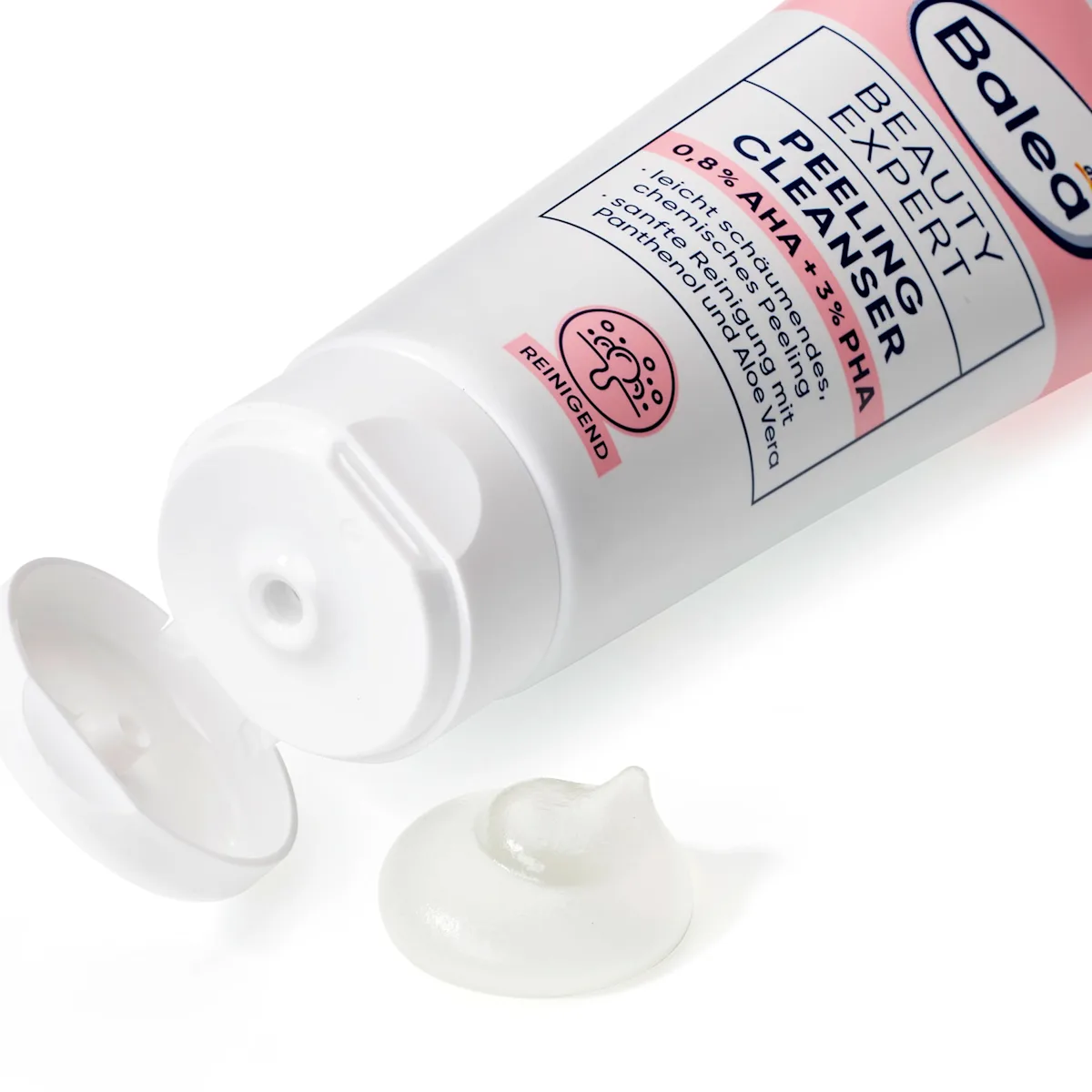 Balea Beauty Expert Peeling Cleanser offers effective care with concentrated ingredients, optimally tailored to the needs of the skin. AHA and PHA – Alpha hydroxy and polyhydroxy acids are acids of natural origin that penetrate the upper layer of the skin and gently remove dead skin cells.
