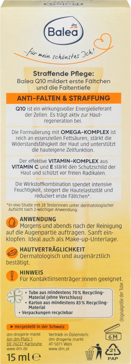 Balea Q10 anti-wrinkle eye cream is a firming care that can soften the first wrinkles and reduce the depth of wrinkles.