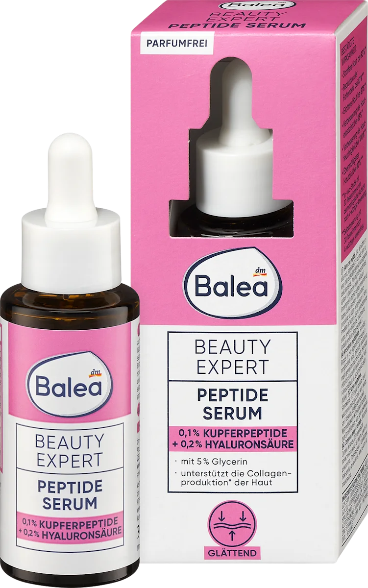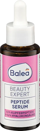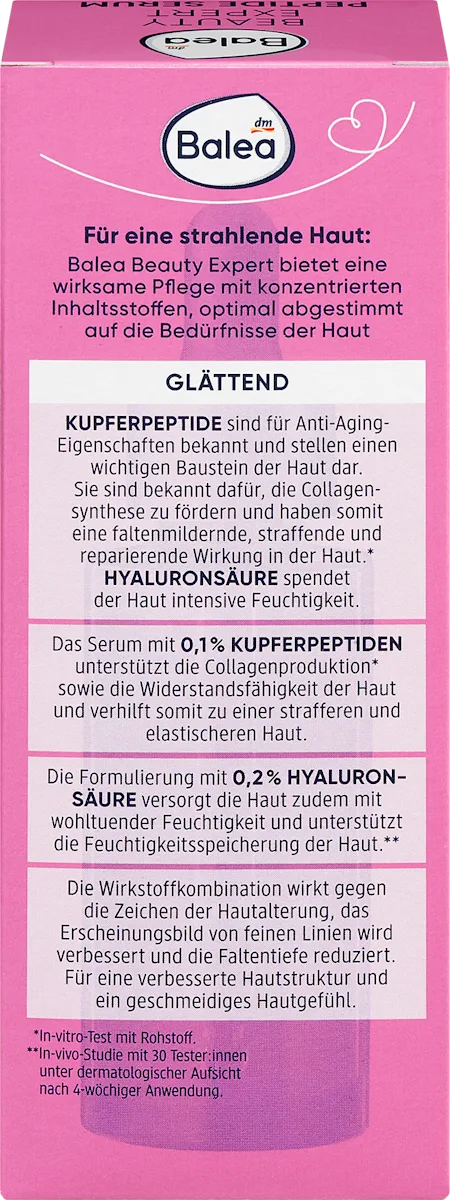 Balea Beauty Expert offers effective care with concentrated ingredients, optimally tailored to the skin’s needs. Copper peptides are known for their anti-aging properties and are an important building block of the skin. They are known to promote collagen synthesis and thus have a wrinkle-reducing, firming, and repairing effect in the skin. Hyaluronic acid provides the skin with intensive moisture. The serum with 0.1% copper peptides supports collagen production* as well as the skin’s resilience, thus helping to achieve firmer and more elastic skin. The formulation with 0.2% hyaluronic acid also provides the skin with soothing moisture and supports the skin’s moisture retention. The active ingredient combination works against the signs of skin aging, improving the appearance of fine lines and reducing the depth of wrinkles. For improved skin structure and a smooth skin feel.