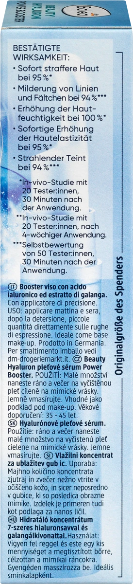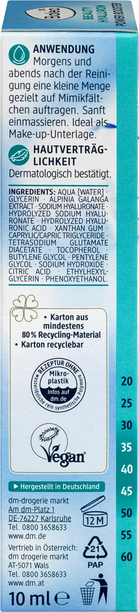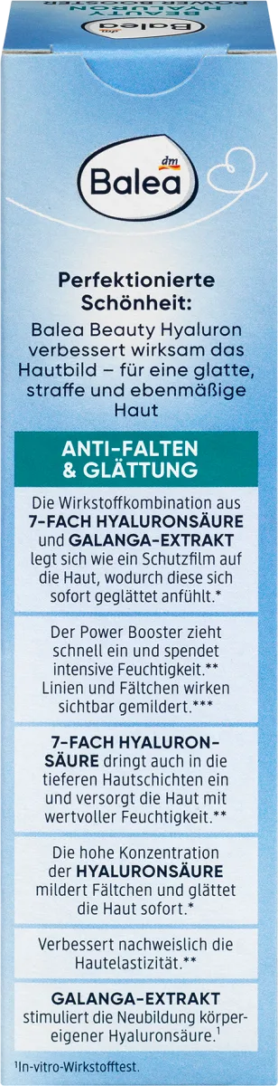 Perfected beauty: Balea Beauty Hyaluron effectively improves the skin appearance – for a smooth, firm and even skin The active ingredient combination of 7-FOLD HYALUR ACID and GALANGA EXTRACT lays on the skin like a protective film, which makes it feel immediately smoothed.