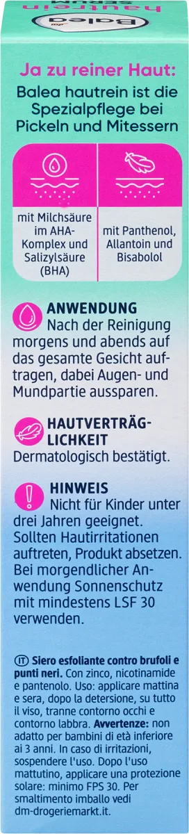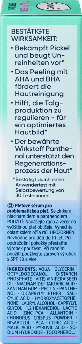 Lactic acid (in the AHA complex) and salicylic acid (BHA) act as a chemical peeling and gently dissolve dead skin cells.