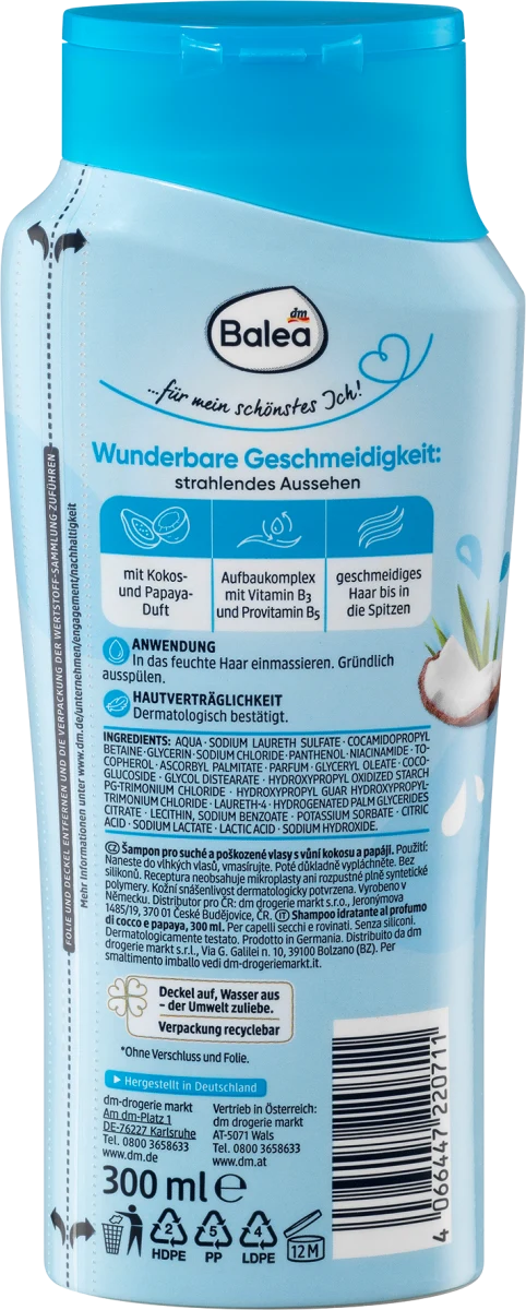 The shampoo moisture from Balea ensures a wonderful suppleness of the hair to the tips thanks to the build-up complex with vitamin B3 and provitamin B5.