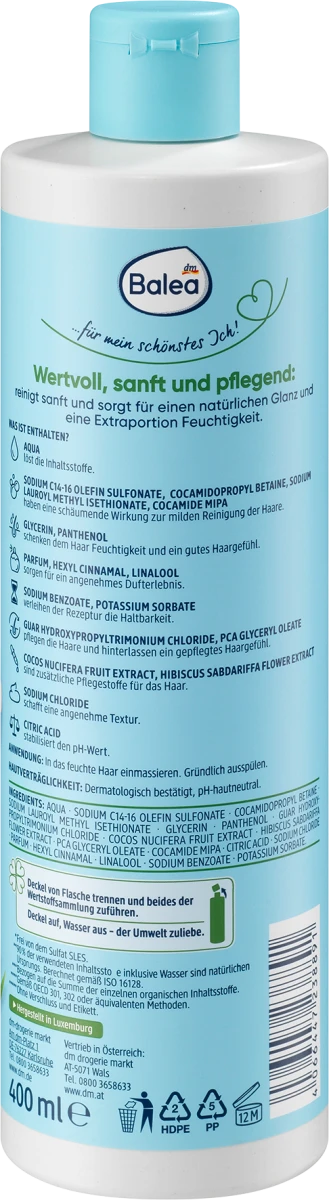 The Balea Natural Beauty moisturizing shampoo with organic hibiscus extract & coconut milk gently cleanses and ensures a natural shine and an extra portion of moisture.