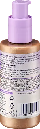 For body use, apply two pumps to the skin and massage in gently for a perfect glow. On the face: Apply one pump to the back of your hand and gently pat in with your fingertips.