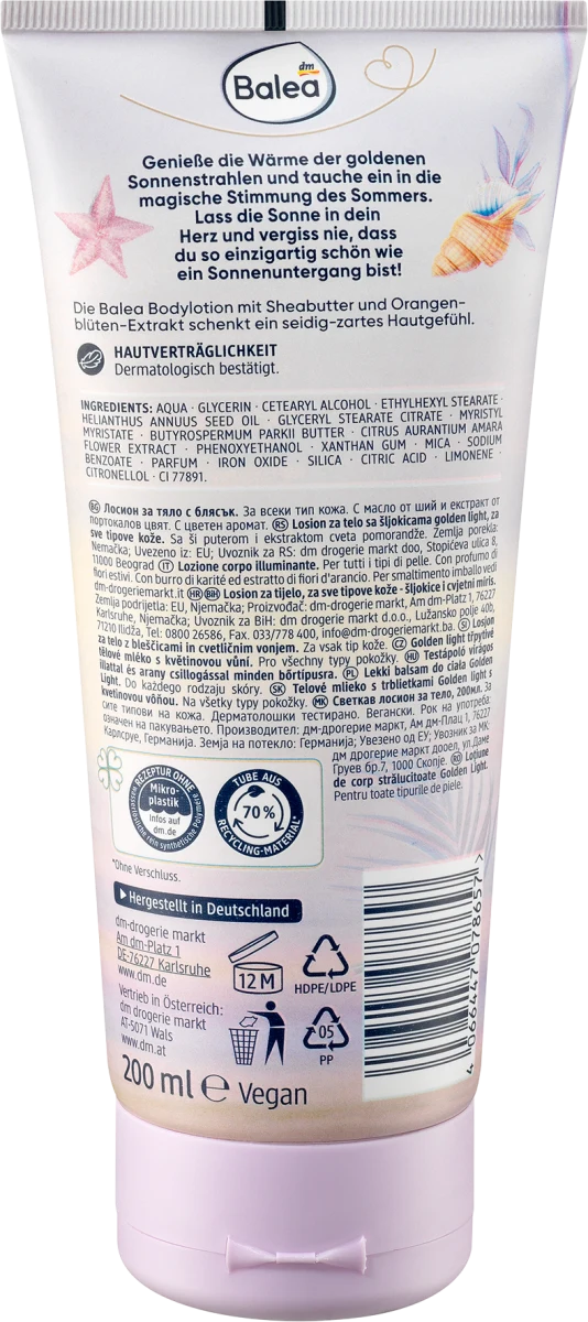 The Balea shimmer lotion Golden Light with shea butter and orange blossom extract nourishes the skin and provides intensive moisture.