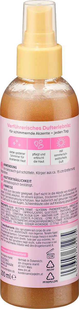 The shimmer spray Bloomy Paradise by Balea not only provides a summery-exotic fragrance, but also leaves a delicate golden shimmer on the skin. In addition, the skin is refreshed and cared for.