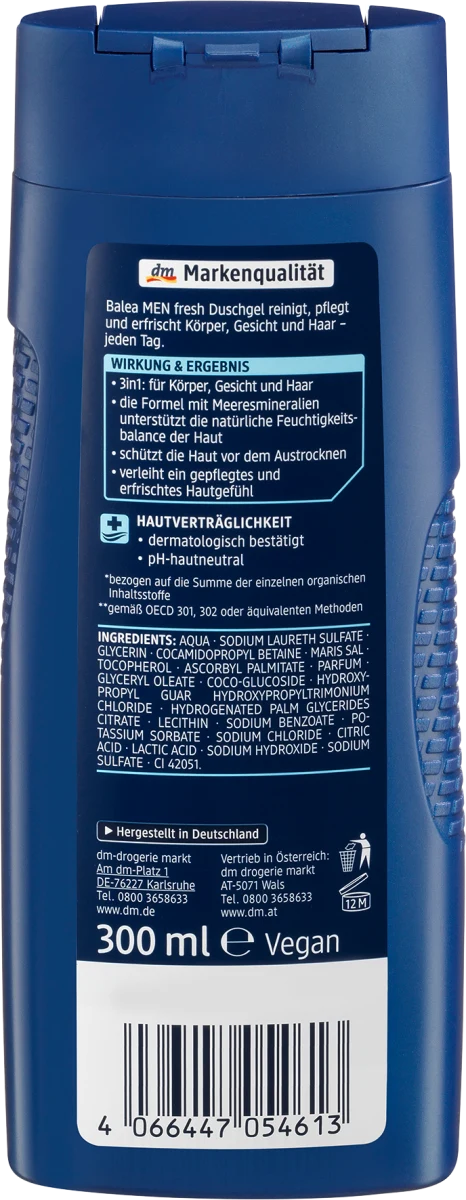The shower gel Fresh from Balea MEN makes it possible! With its 3in1 function, the shower gel cleanses and nourishes the body, face and hair.